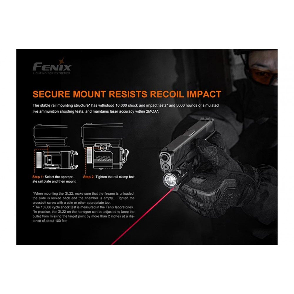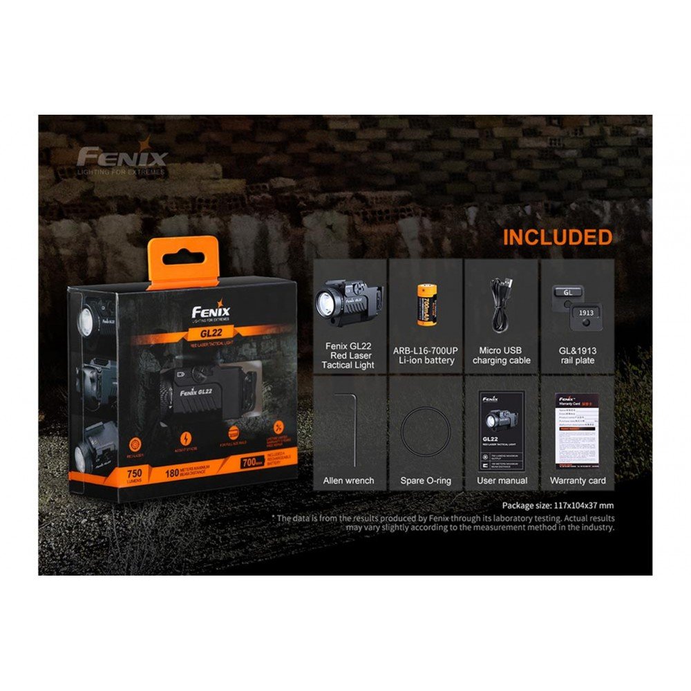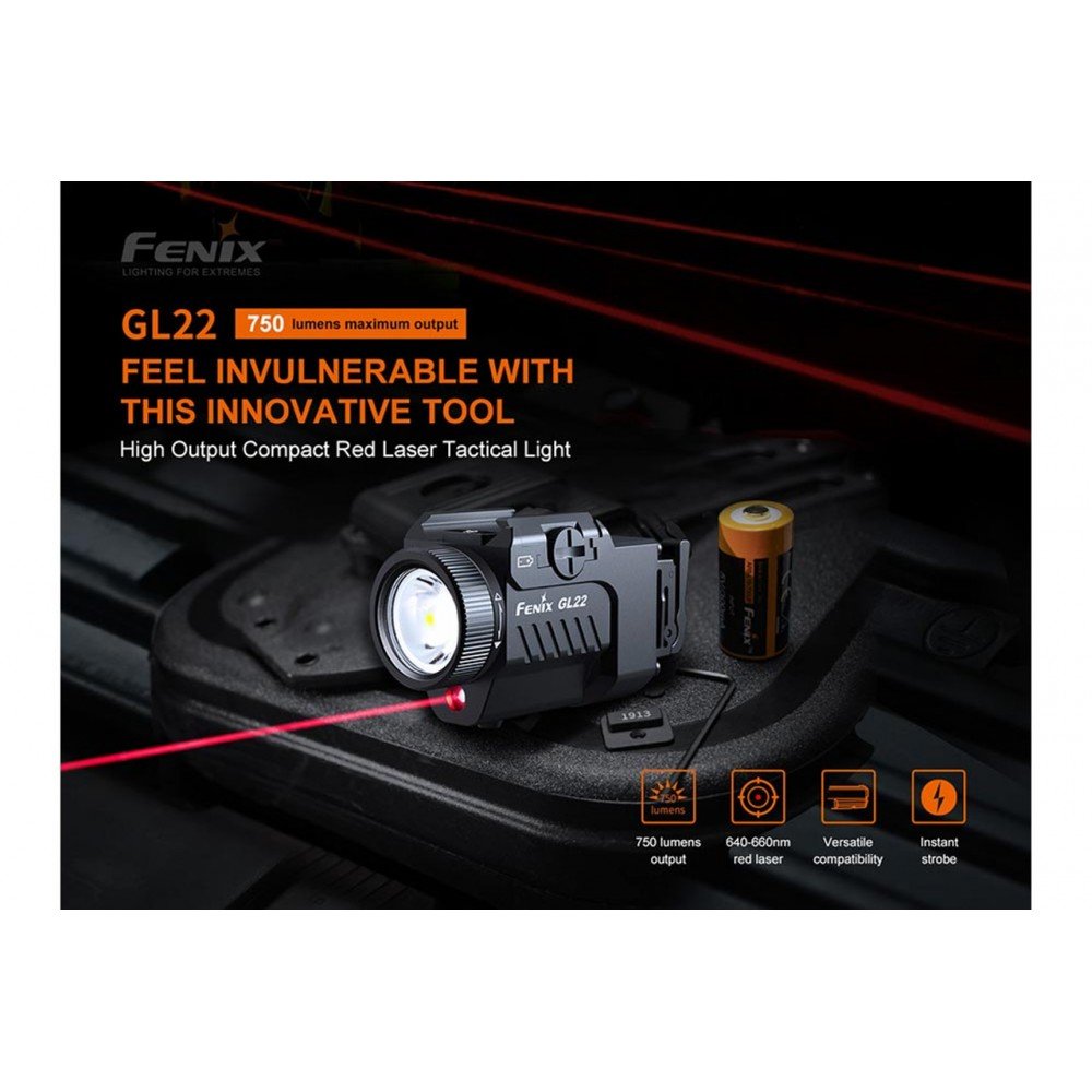 Fenix GL22, este mult asteptata lanterna tactica Fenix pentru pistoale , echipata cu un marcator laser, un comutator cu doua fete, un stroboscop si un flux puternic de 750 de lumeni cu o raza de actiune de pana la 180 de metri. Include baterie ARB-L16-700UP si cablu de incarcare.