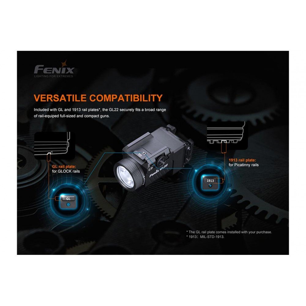 GL22 este compatibila cu șina Glock și MIL-STD-1913 Picatinny, inclusiv Glock 36 cu șină standard și Springfield XD.