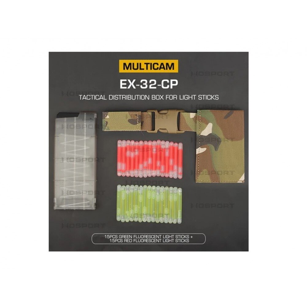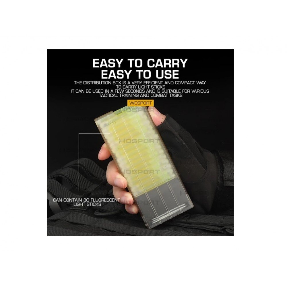 Tactical Distribution Box este un organizator compact și specializat pentru stick-uri luminoase (light sticks), conceput pentru a permite marcarea rapidă, discretă și sigură în condiții de iluminare redusă. Construcția de tip „incarcator” permite depozitarea și distribuirea facilă a stick-urilor direct de pe centură, din buzunar sau montat pe sistemele MOLLE ori în suporturi Kydex. Versiunea în camuflaj Multicam este pregătită pentru utilizare imediată: pachetul conține 15 stick-uri verzi și 15 stick-uri roșii, fiecare având o lungime de aproximativ 2 inchi (5 cm) și un timp de iluminare de circa 5 ore — suficient pentru misiuni, exerciții tactice sau marcaje de urgență.