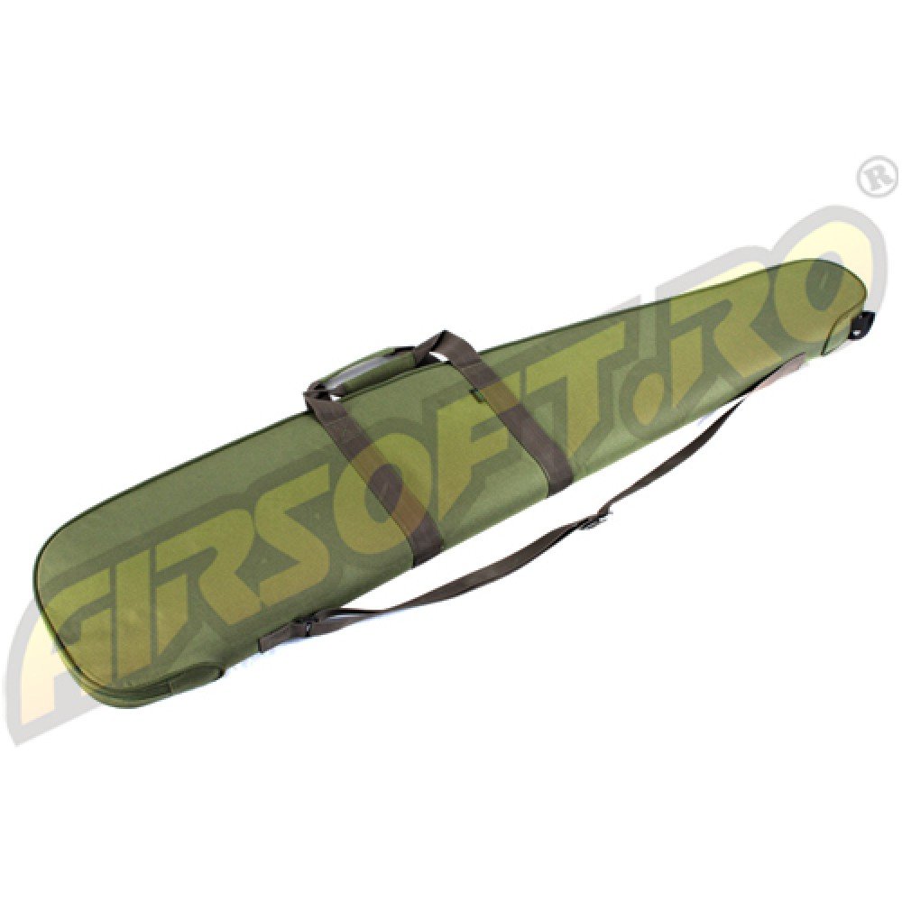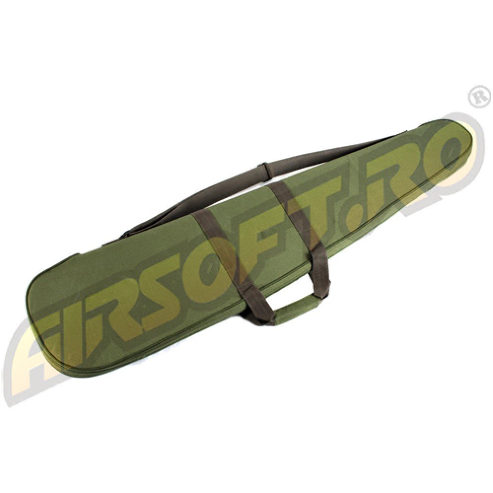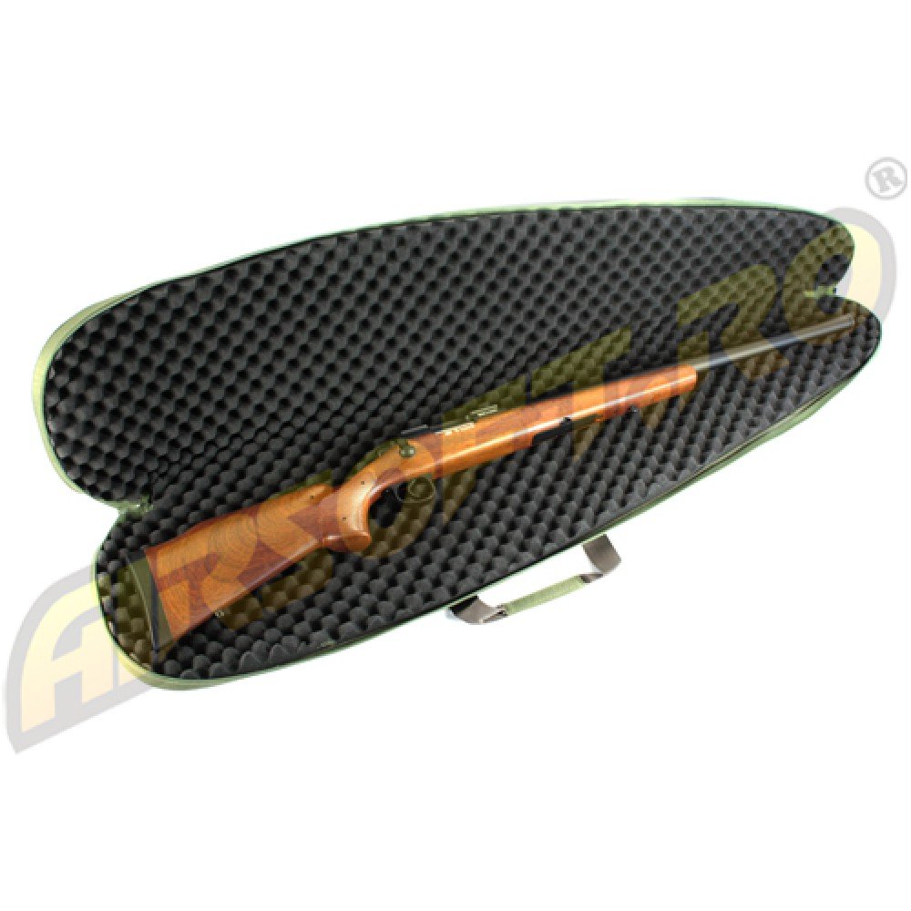 Valigia trasporto imbottita con spugne tipo fave. Questa è di tessuto, colore oliva (verde). La valigia è dotata di maniglia per trasporto a mano e di bretelle per il trasporto tipo zaino. La chiusura si fa con zip. Ideale per fucili da cecchino!