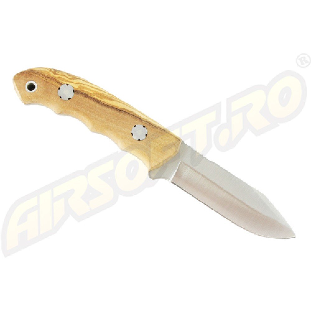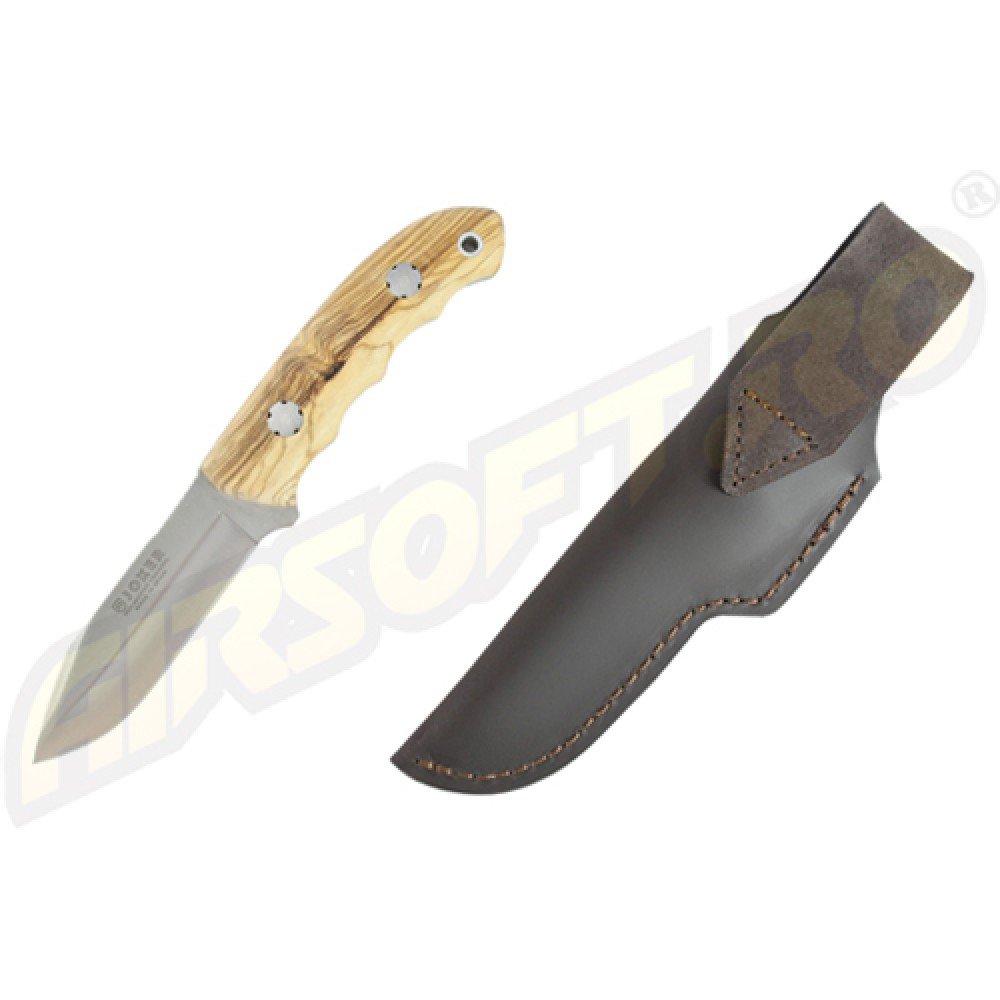 Coltello da caccia. Il manico è in legno d'ulivo ed è dotato di fodero in cuoio con sopporto di aggancio sulla cintura.