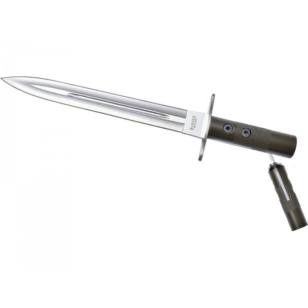 Pachetul contine: pumnalul, teaca pentru pumnal, manerul de sulita si husa de transport pentru manerul de sulita. Pumnalul poate fi utilizat si fara manerul de sulita.