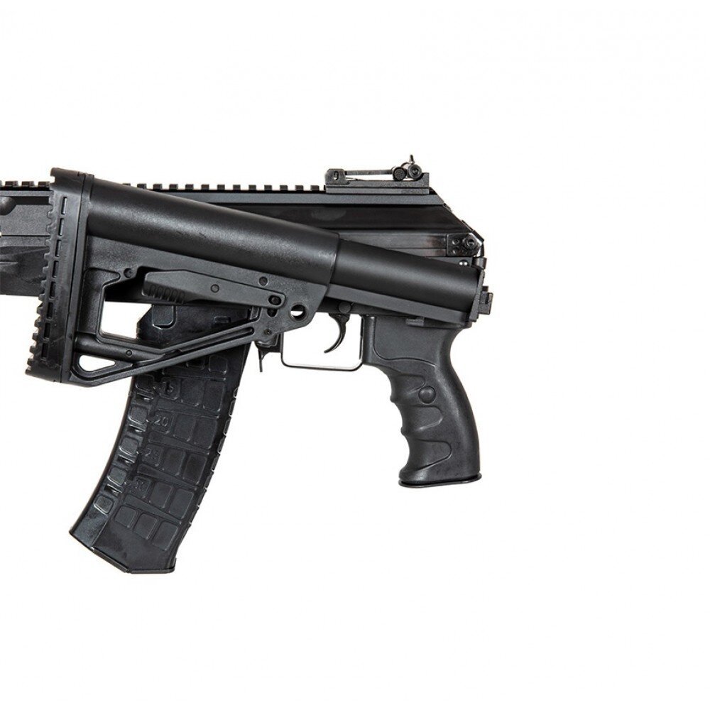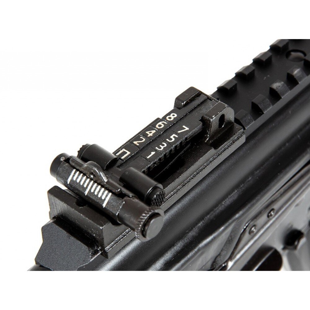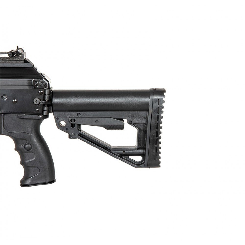 Stock-ul este reglabil și are posibilitatea plierii pe lateral (folding stock).
