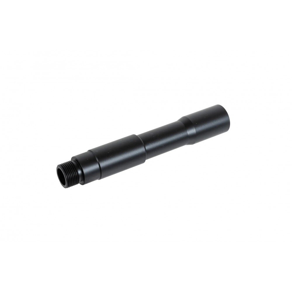 Realizată din aliaj de aluminiu cu finisaj negru rezistent, această extensie adaugă aproximativ 100 mm în zona gurii țevii și este prevăzută cu filet 14 mm CCW, permițând montarea accesoriilor compatibile precum amortizoare false (mock suppressors) sau unități tracer.