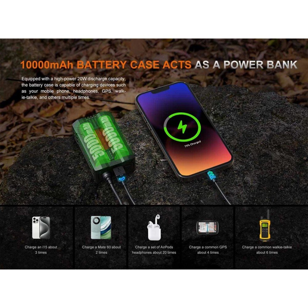 The two built-in 5000mAh batteries within the battery case offer an ultra-long runtime of 500 hours and can charge other digital devices.
